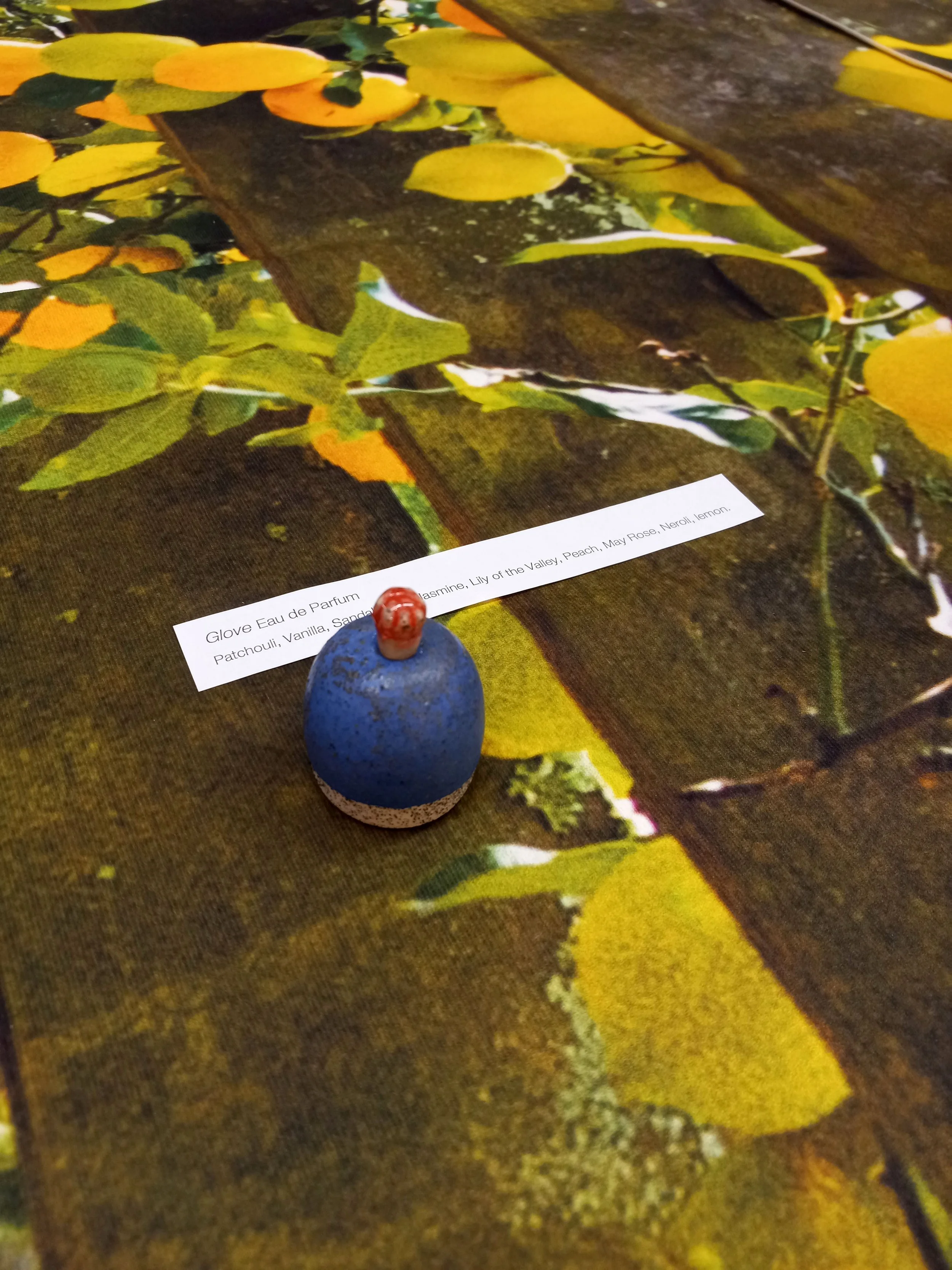 Ambergris. Research project combining botanical textile dying and perfume ingredients and methods with historical formulation and a collaboration in ceramic bottle design with Meg Hubert. 2021.